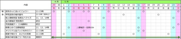 Dates: April 29 (Sat), May 2 (Sat), 3 (Sun), 5 (Tue/Holiday), 6 (Wed/Holiday), 10 (Sun), 17 (Sun), 24 (Sun)