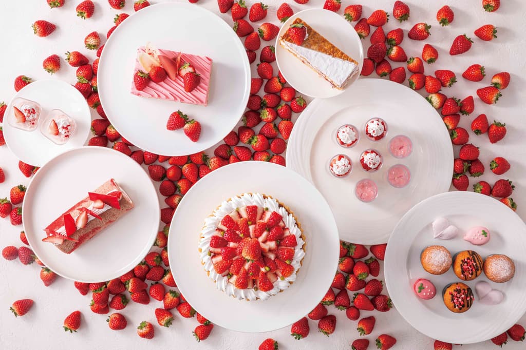 The buffet table brings together a generous variety of strawberry creations. Alongside the classic strawberry shortcake, guests can find mille-feuille, cheesecake, mont blanc, tiramisu, and parfait, covering a range from light sponge-based sweets to richer cream-centered desserts.