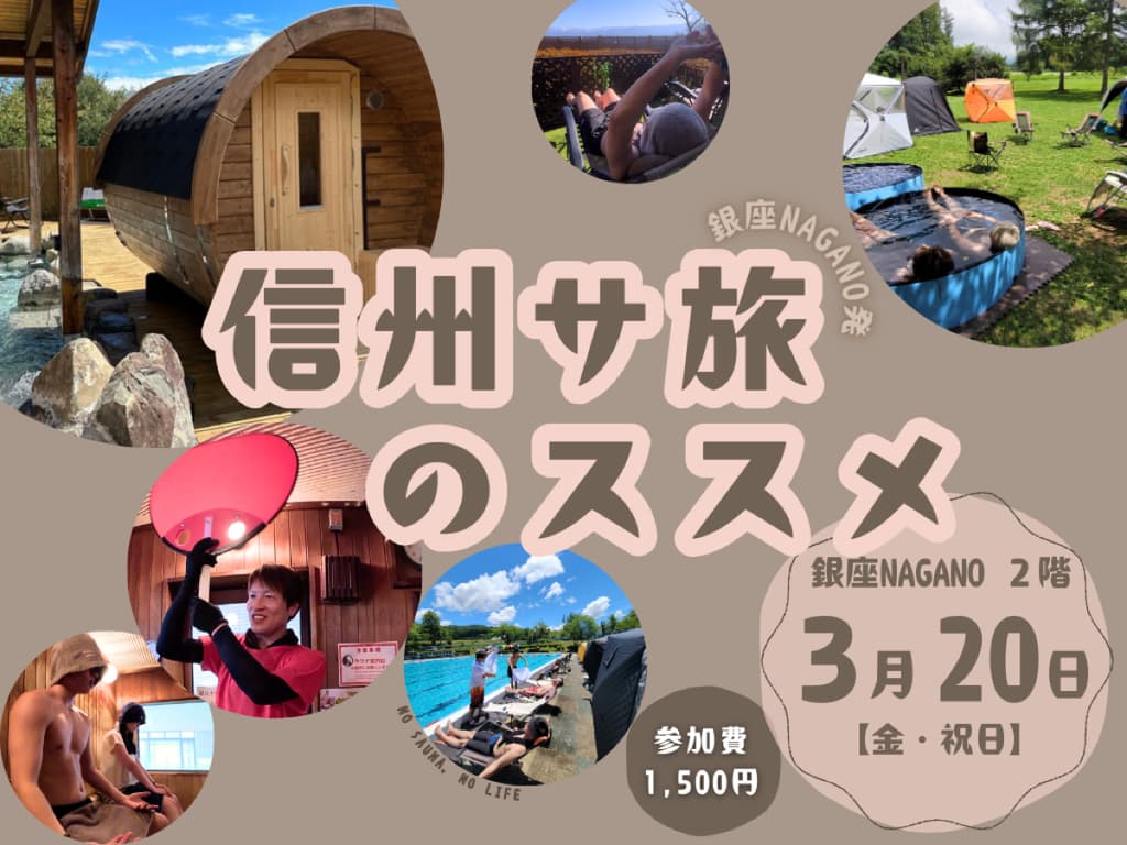 Ginza NAGANO, the Nagano Prefecture information hub in central Tokyo, is hosting a sauna enthusiast gathering on March 20, 2026 (Friday, national holiday). The event, titled "Shinshu Sauna Travel Recommendations" (信州サ旅のススメ), brings together sauna professionals from Nagano to introduce the region's growing sauna culture to metropolitan audiences.