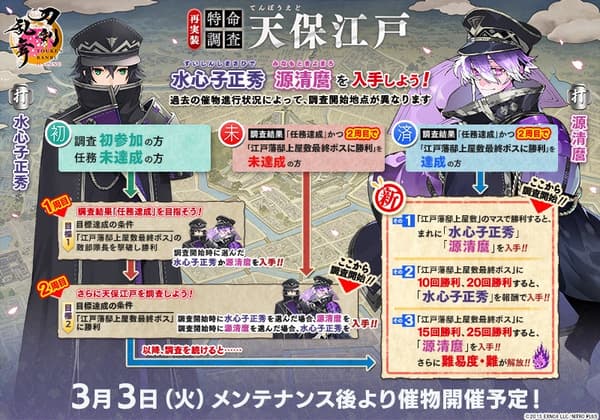 The Special Investigation: Tenpou Edo event is set in an abandoned world — a historically-altered Tenpou Edo era. Players roll dice and advance across a board, and by meeting certain conditions can obtain the sword warriors Suishinshi Masahide (CV: Atsushi Abe) and Minamoto Kiyomaro (CV: Kenji Akabane).