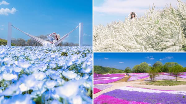 The "Moss Phlox and Nemophila Hill" event is currently underway at Flower Village Hanayume no Sato in Sera, Hiroshima. As of April 8, 2026, both nemophila and moss phlox are in peak bloom, along with yukiyanagi (snow fountain) and rape blossoms.