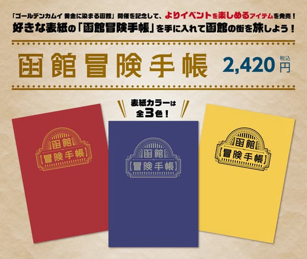 The Hakodate Adventure Notebook is a new item designed to help visitors make the most of the "Golden Kamuy: Golden Hakodate" event. The cover comes in 3 colors, and each participating store features a commemorative stamp for visitors to collect. Record travel memories in the notebook and create a one-of-a-kind Hakodate Adventure Notebook.