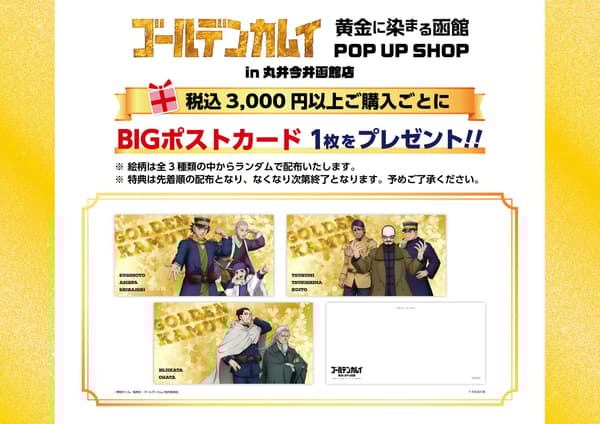 As part of the "Golden Kamuy: Golden Hakodate" special event held across Hakodate, Hokkaido, a range of event-exclusive original merchandise has been released. A POP UP SHOP is also opening at Marui Imai Hakodate Department Store, featuring scene photo panel displays and purchase bonuses for visitors.