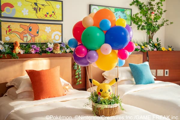 Two plans are available: a suite stay limited to one room per day, and a standard stay limited to eight rooms per day. A total of nine rooms have been transformed with Pokémon-themed decorations — featuring greenery and flowers as a base, alongside artwork and decorations of Pokémon from the original Pokémon Red and Green games — creating the feel of embarking on a Pokémon adventure. All rooms feature Pikachu flying off on a balloon adventure among the decorations.