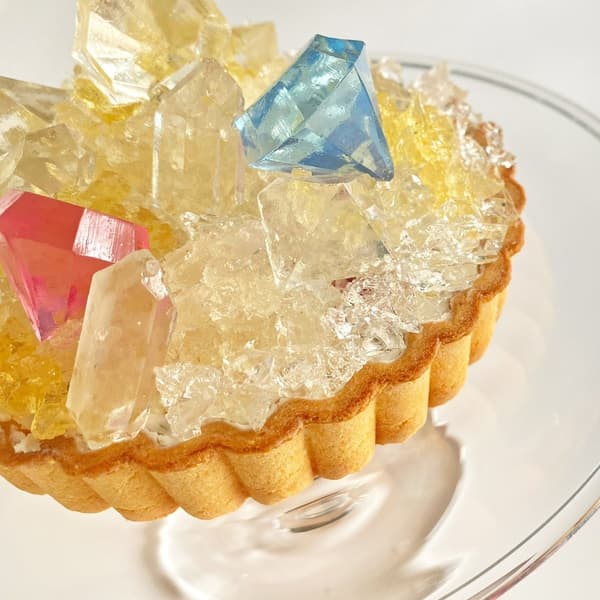 Each month, Harapecolab crafts a limited-quantity special ice cake series inspired by that month's birthstone. The April edition pays tribute to the diamond, with its gem-like brilliance expressed through hand-cut agar confections. The tart features agar pieces in yellow, pink, and blue hues, capturing the varied sparkle of different diamond types.