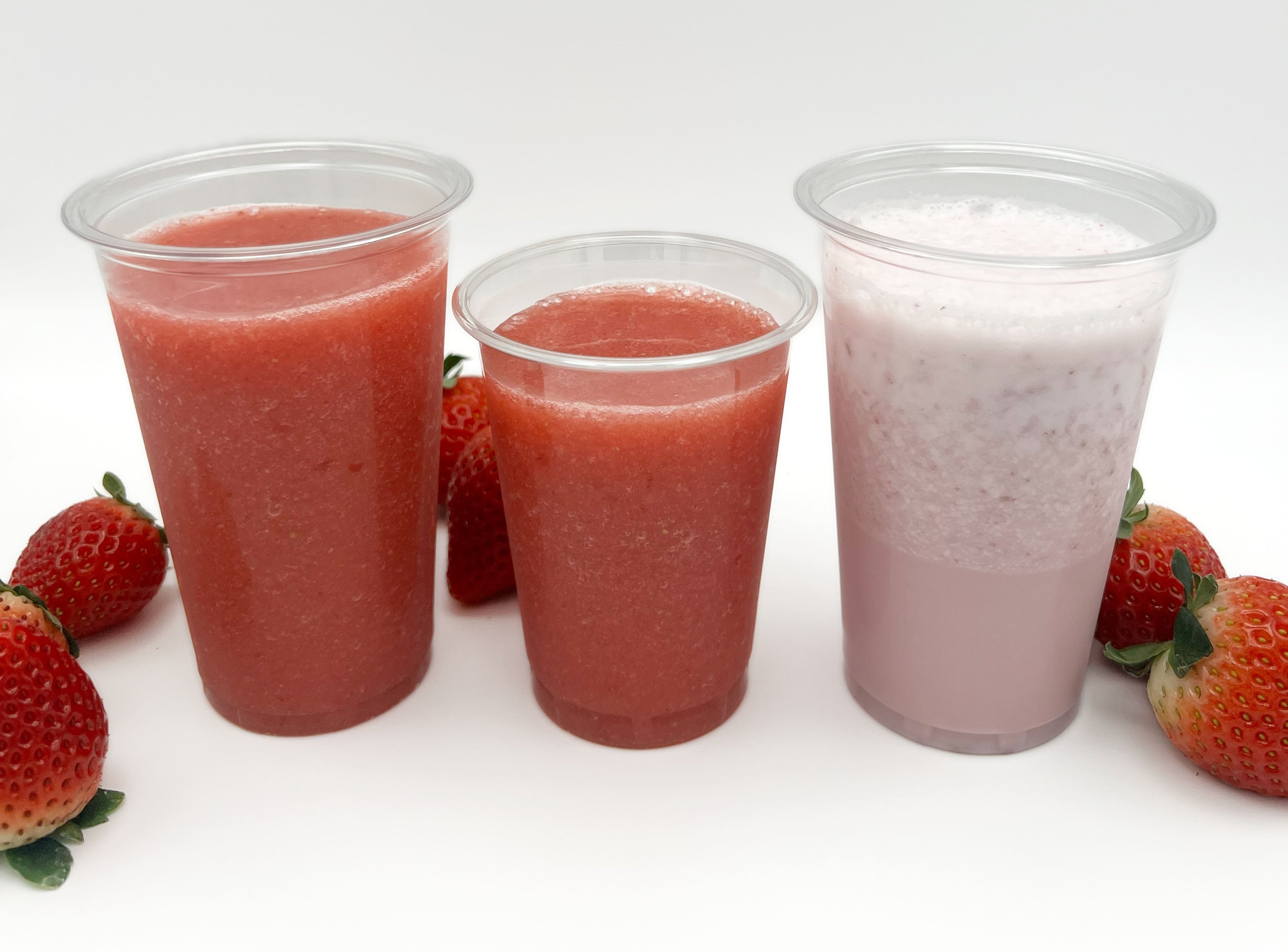 〈yamasan〉Kumamoto Ripe Strawberry Smoothie S ¥702 / M ¥918, Kumamoto Ripe Strawberry Milk M ¥756 (Using Yubeni strawberries)