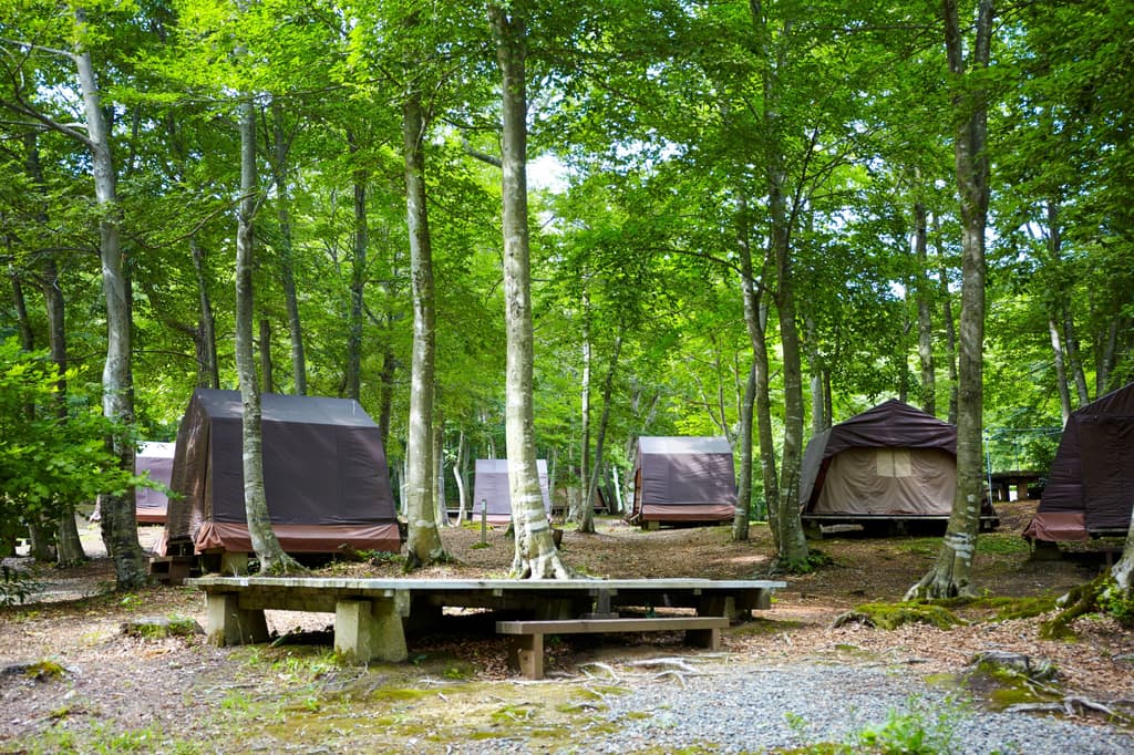 The campsite sits in a highland forest at mid-elevation on Mt. Haguro, within the grounds of Kyukamura Shonai Haguro. With the hotel just a 3-minute walk away, the setup is particularly reassuring for first-time campers and families with young children.
