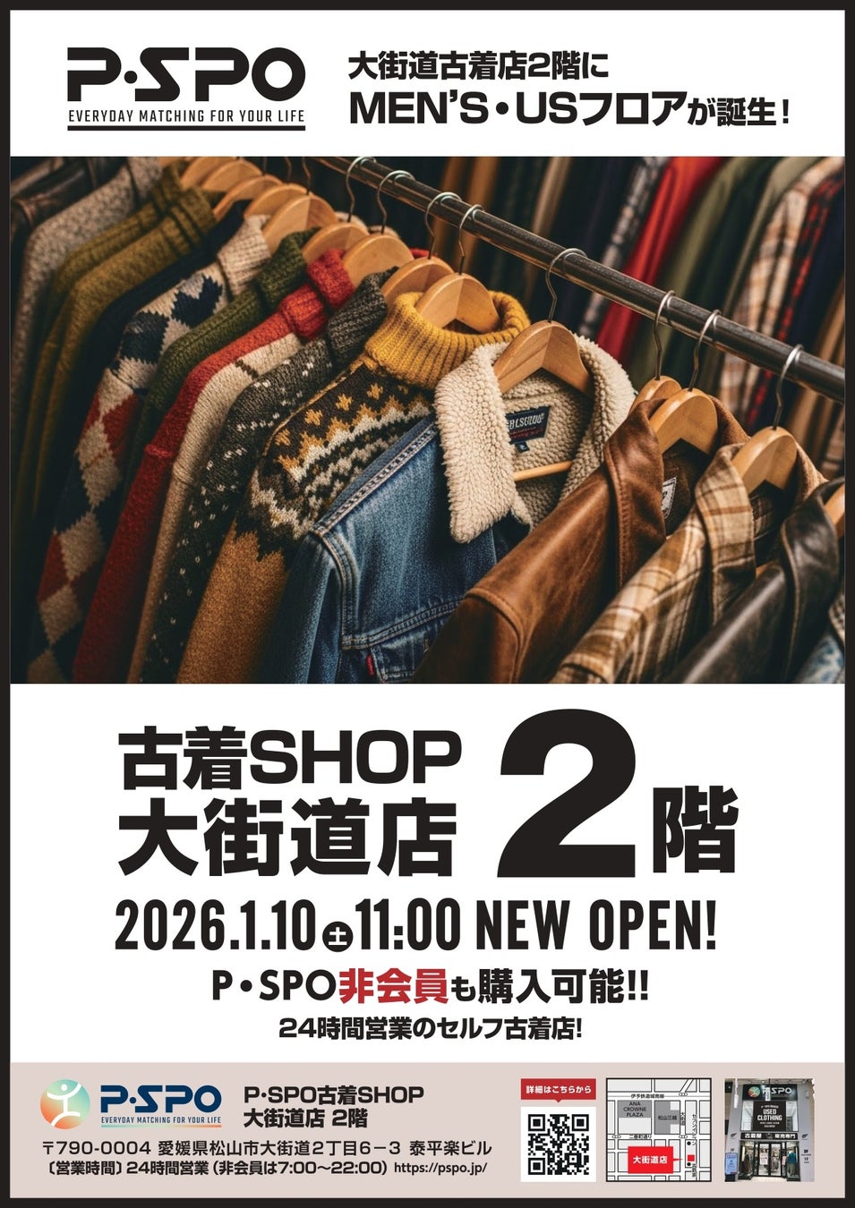 The vintage clothing shop on Okaido Street in Matsuyama, Ehime Prefecture will open its newly renovated second floor on January 10, 2026 (Saturday). The store has restructured its floor layout, with the first floor dedicated to women's vintage clothing and the second floor focusing on men's and US vintage wear with an American casual theme.