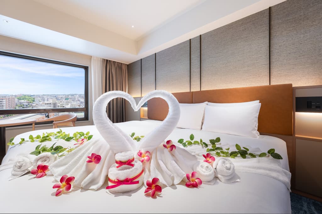 Since its opening in 1975, the hotel has served as a venue for important gatherings, ceremonies, and personal milestones in Okinawa. As part of this new plan, staff welcome guests with a handcrafted towel sculpture of two swans facing each other — a nod to the bird's symbolism of purity, grace, and beauty. Swans are also known as migratory birds that travel together across roughly 3,000 km, supporting one another along the way, making them a natural symbol of shared journeys through life.