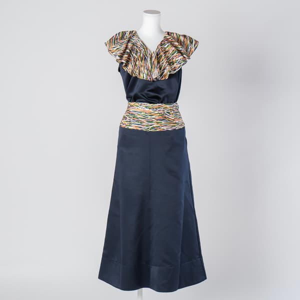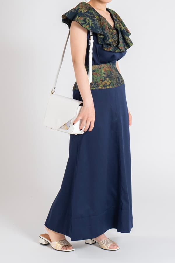 An A-line long skirt with kimono fabric boldly integrated at the waist, creating a look reminiscent of wearing a kimono. The high waist setting creates a leg-lengthening effect for a streamlined overall appearance. Paired with the frill blouse from the same series, the combination forms a sophisticated and vibrant set-up style.