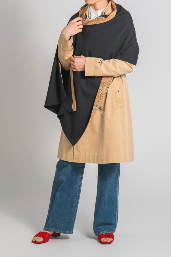 Relier81's first-ever stole. A subtle accent of traditionally dyed black silk kimono fabric is woven into a basic-colored base cloth, bringing vibrancy to any outfit. Smooth, lightweight, and seasonless, it features buttons for a variety of styling options. Designed to be unisex, it works equally well as a personal item or a gift.