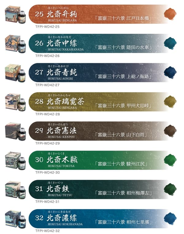 The Ukiyo-e Ink series consists of water-based dye inks for fountain pens, with colors inspired and tuned after traditional ukiyo-e woodblock print artworks. The series is produced by stationery sommelier Dai Ishizu and color-supervised by color consultant Hanae Matsumoto.