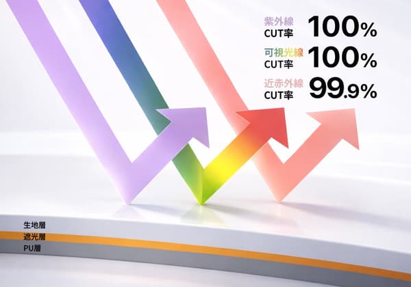 Sunlight consists of three wavelength types: ultraviolet, visible light, and near-infrared. TOUGHNESS Instant Pleats uses a 100% polyester canopy with a black TPU laminate on the reverse side to block all three wavelengths. Near-infrared rays — the primary driver of heat — are cut by 99.9%, achieving a heat-blocking efficiency of 89% or higher (up to approximately 92%). All figures are the results of testing conducted by a third-party inspection body in accordance with JIS standards.