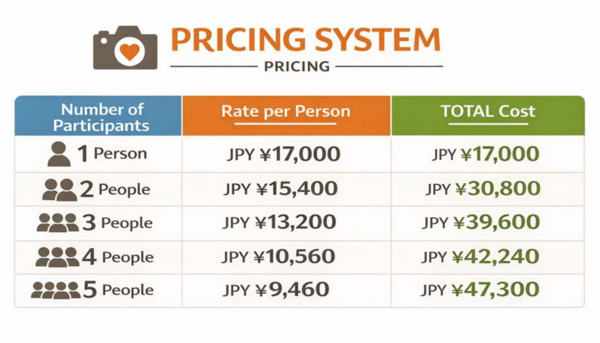Photography sessions are available anywhere in Yokohama and can be booked up to 3 days in advance. We'll arrange for an English/Chinese/Korean-speaking photographer.