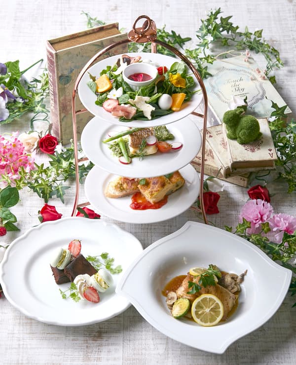Este curso de estilo stand mantiene las verduras de primavera y los huevos al frente y al centro, con un motivo juguetón de Conejo Blanco que recorre todo. El nivel superior presenta una ensalada de frutas que evoca un jardín de primavera con un Conejo Blanco correteando a través de él, vestido con aderezo de fresa. El nivel medio contiene una dorada salteada con salsa de albahaca y verduras de primavera, y el nivel inferior presenta una tortilla de verduras de primavera junto con un sándwich abierto de huevo y jamón.