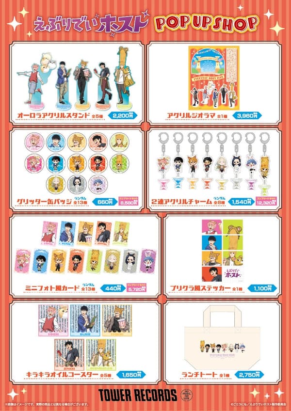 Una TIENDA POP UP para el anime de TV Everyday HOST CLUB se llevará a cabo en Tower Records Shibuya (2F, cerca de la escalera mecánica ascendente) y en las tiendas Tower Records Abeno Hoop del 5 de marzo (jueves) al 15 de marzo (domingo) de 2026. La tienda presenta mercancía con ilustraciones recién dibujadas con el tema de los "parques temáticos".
