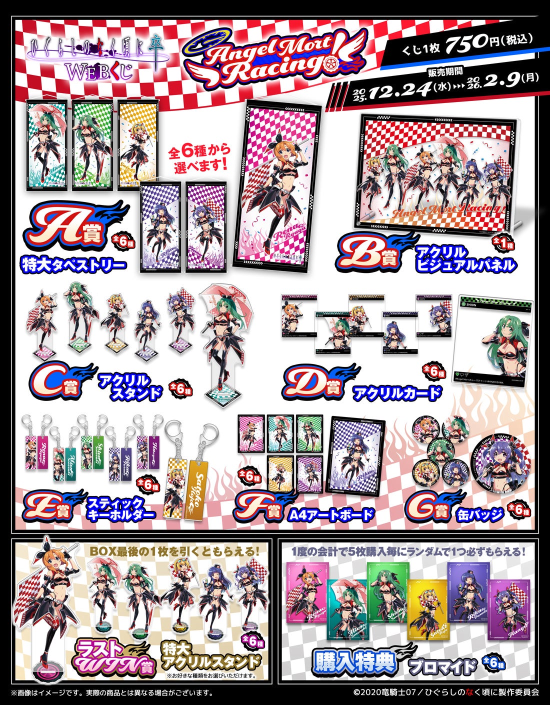 La décima entrega de la serie de Lotería Web presenta mercancía de Higurashi: When They Cry – SOTSU. Esta nueva lotería muestra un tema de «race queen» inspirado en Angel Mort, con ilustraciones completamente nuevas de seis personajes dibujadas por el diseñador de personajes Akio Watanabe.