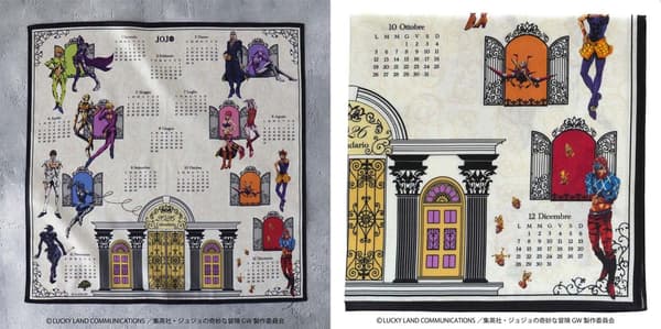 El diseño 'Golden Wind' captura la atmósfera del anime con esquemas de color sofisticados. El 'Pañuelo Calendario' presenta a todos los personajes principales y también funciona como calendario de 2026 con texto en italiano, manteniéndose fiel al escenario de la serie.