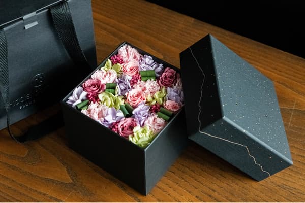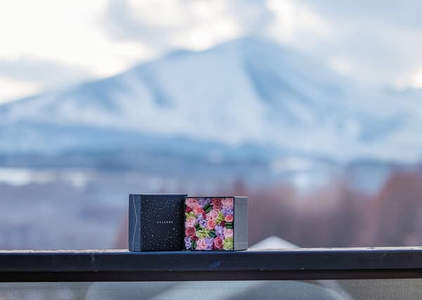 También se creó una caja de flores especial para el 5.º aniversario. Los lados de la caja presentan un diseño inspirado en la silueta del monte Asama, que expresa la conexión con la naturaleza no solo a través de las propias flores, sino también a través del embalaje en su conjunto. La pieza incorpora aproximadamente 20 tipos de flores y follaje, y el diseño prioriza una forma redondeada que se ve hermosa desde cualquier ángulo.