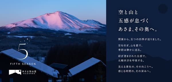 ASAMA KUZANBO celebrará su 5.º aniversario el 26 de abril de 2026 (domingo). El complejo ha establecido «Donde el cielo, la montaña y los cinco sentidos respiran en Asama, y más allá» como el concepto para el año del aniversario. A lo largo del año, el complejo planea ofrecer experiencias que permitan a los huéspedes disfrutar de la naturaleza y las estaciones de Kitakaruizawa a través de los cinco sentidos.