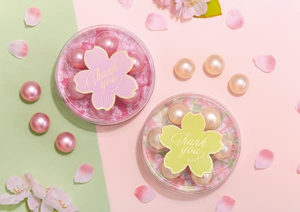 Un juego de seis perlas de baño hidratantes con aceite y apariencia de perla que atrae la sensibilidad femenina. Cuando se agregan al baño, liberan un suave aroma a flor de cerezo e ingredientes para el cuidado hidratante, creando una experiencia de baño suave.
