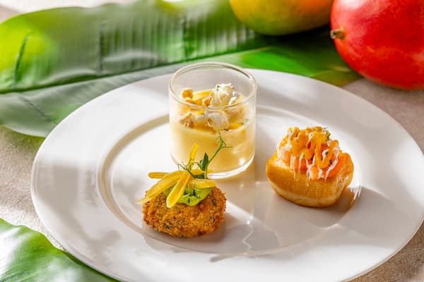 La selección incluye un suave pudín de mango cubierto con lujoso mango de Miyazaki, así como orangette recubierta de chocolate ahumado servida con una crema para mojar de mango y maracuyá. Los dulces están diseñados para transmitir tanto la frescura como la profundidad de los sabores del principio del verano. En cuanto a los bocadillos salados, destacan una hamburguesa de pollo cubierta con guacamole y mango seco, y un rollo de camarones combinado con pico de gallo y mayonesa de mango: una selección ligera y fresca. Los huéspedes pueden disfrutar de la experiencia en el espacioso atrio del hotel con techos de 27 metros de altura mientras la luz del principio del verano llena el espacio.