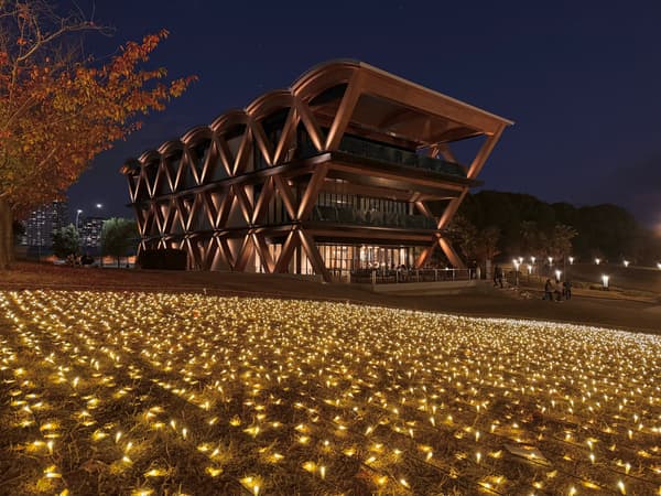 La iluminación «YOKOHAMA TIMBER WHARF IllumiWalk 2025» se está llevando a cabo actualmente en el césped cerca del Muelle de Madera de Yokohama.