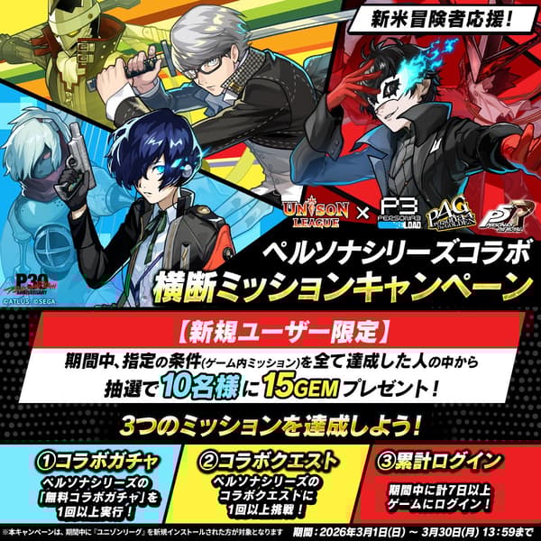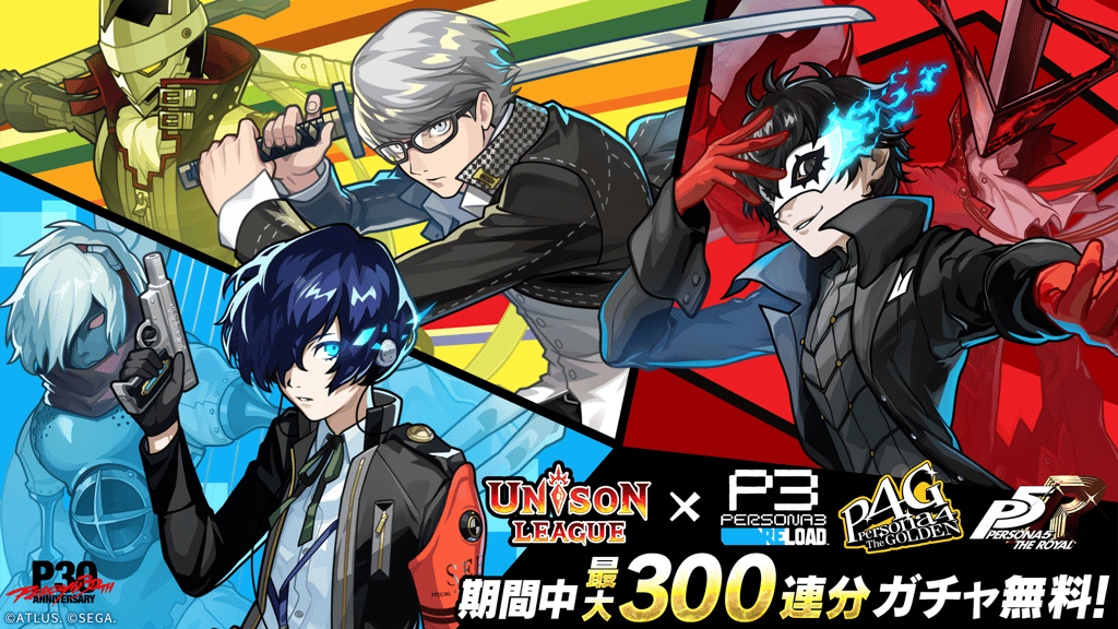 Unison League, el RPG para smartphones en tiempo real, presenta una colaboración por tiempo limitado con la serie Persona a partir del 1 de marzo de 2026. La colaboración abarca tres títulos: Persona 3 Reload, Persona 4 Golden y Persona 5 Royal, que se ejecutarán secuencialmente hasta el 30 de marzo de 2026.