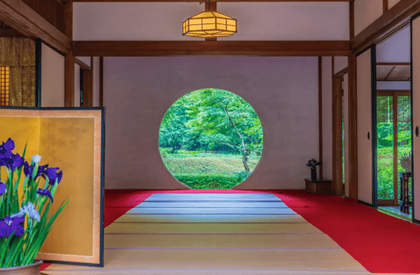 Conocido como el “Templo de la Hortensia”, su ventana redonda enmarca paisajes estacionales como una pintura viva.