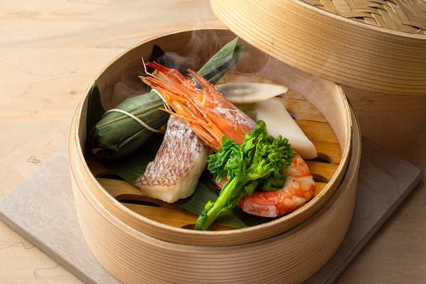 도미와 보리새우 대나무 찜 - 치마키, 죽순, 유채꽃을 곁들이고 떡갈나무 잎의 향을 더함