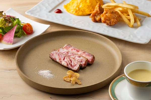 철판에서 조리한 프라이드 치킨과 오므라이스가 포함된 어린이 메뉴입니다. 4월 28일까지 성인 2인 이상이 쇼부 코스를 예약하면 어린이 1인당 키즈 코스 1개가 무료로 제공됩니다.