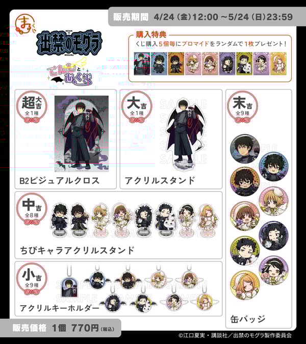 온라인 복권 서비스 '마루쿠지'에서 TV 애니메이션 *출입금지 모구라(Dekin no Mogura)*의 오리지널 캐릭터 굿즈를 만날 수 있는 온라인 복권이 시작되었습니다. 이번 이벤트는 2026년 4월 24일 오후 12시부터 2026년 5월 24일 오후 11시 59분까지 진행됩니다.