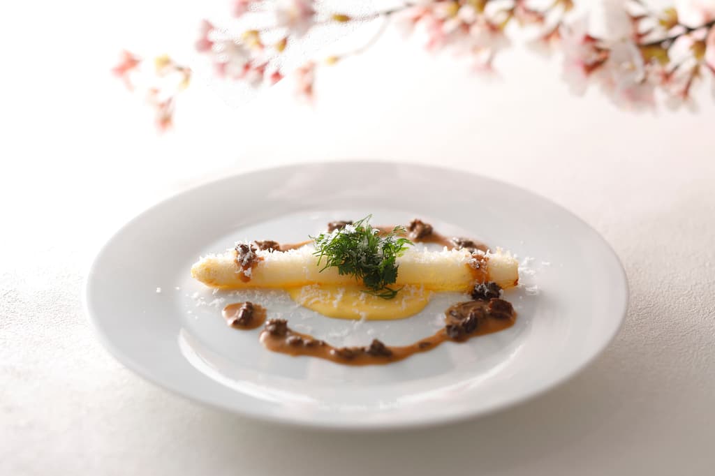 ‘투르 다르장 도쿄’(400년 역사의 파리 본점 유일한 지점)와 호텔 내 다른 레스토랑에서 경력을 쌓고 2025년 벨라 비스타의 총괄 셰프가 된 사이토 신타로 셰프는 이번 봄 시즌 특별 식재료로 프랑스산 화이트 아스파라거스와 사쿠라 새우를 선택했습니다.