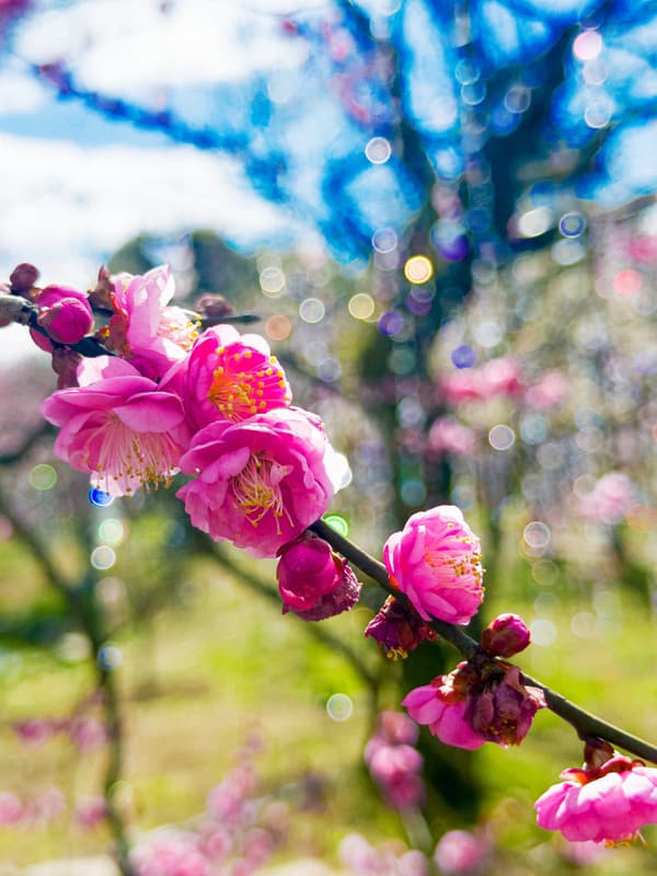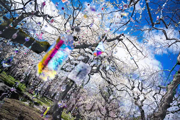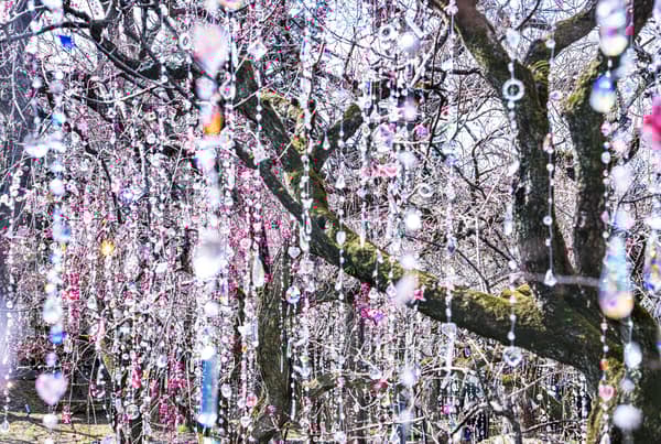 ‘빛과 꽃의 정원’이라는 제목의 야외 미술 설치 작품이 신사의 매화 정원인 하나노니와(꽃의 정원)에 전시됩니다. 1,200개 이상의 크리스탈이 정원 곳곳의 매화나무에 매달려 계절이 바뀌고 하루 동안 빛이 변화함에 따라 다른 모습을 보여줍니다.