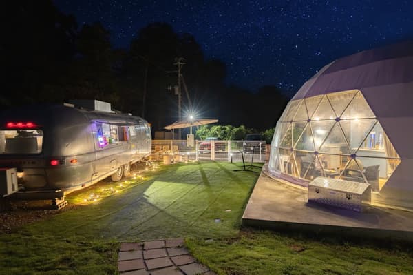 4개의 돔 텐트가 사가미만을 내려다보는 언덕에 독립적으로 배치되어 있어 주변의 간섭이 전혀 없습니다. 밤에는 밤하늘 가득 펼쳐지는 별을 감상할 수 있습니다. 전 객실에 냉난방 시설이 완비되어 있어 사계절 내내 쾌적하게 이즈의 자연을 즐길 수 있습니다.