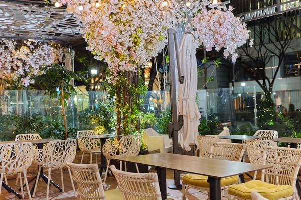 레스토랑의 SAKURA 테라스에서 파르페를 즐길 수 있으며, 이곳에는 인공 벚꽃 나무가 만개해 있습니다.