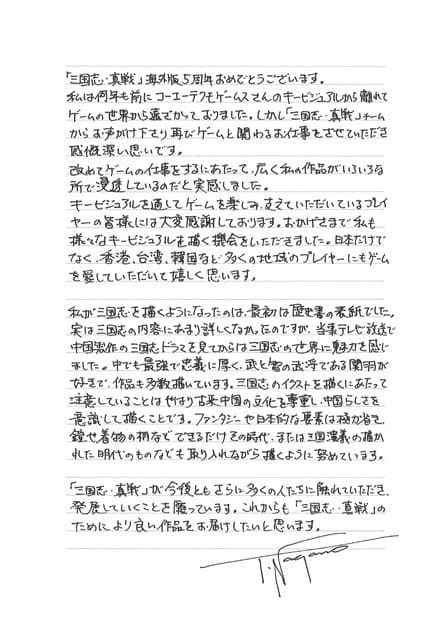삼국지 시리즈의 핵심 일러스트레이터 중 한 명인 나가노 고가 5주년을 축하하는 특별 메시지를 전했습니다. 게임의 수많은 주요 비주얼을 담당했던 그는 이번 타이틀과의 재회와 이용자들로부터 받은 뜨거운 성원에 대한 감회를 밝혔습니다. 또한 창작 철학을 공유하며, 뜻깊은 기념일을 맞이한 게임이 앞으로 더욱 발전하기를 바라는 마음을 전했습니다.