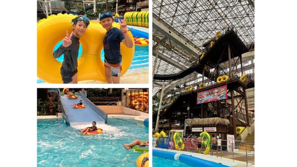 리조트에는 일본 최대의 수직 낙하와 가장 긴 길이를 자랑하는 ‘빅 알로하’를 비롯해 튜브 슬라이드 등 다양한 워터 슬라이드가 있습니다. 가장 큰 슬라이드 참여는 선택 사항이며, 원하는 어린이는 대신 공원의 다른 구역을 즐길 수 있습니다.