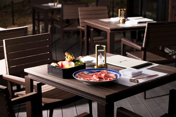 나무 데크 테라스는 20석을 수용하며 공원으로 바로 연결됩니다. 낮에는 부드러운 자연광 아래에서 식사를 즐길 수 있으며, 저녁부터는 등불이 교토 특유의 분위기를 연출합니다. 좌석이 제한되어 있으므로 사전 예약(전화로 가능)을 권장합니다.