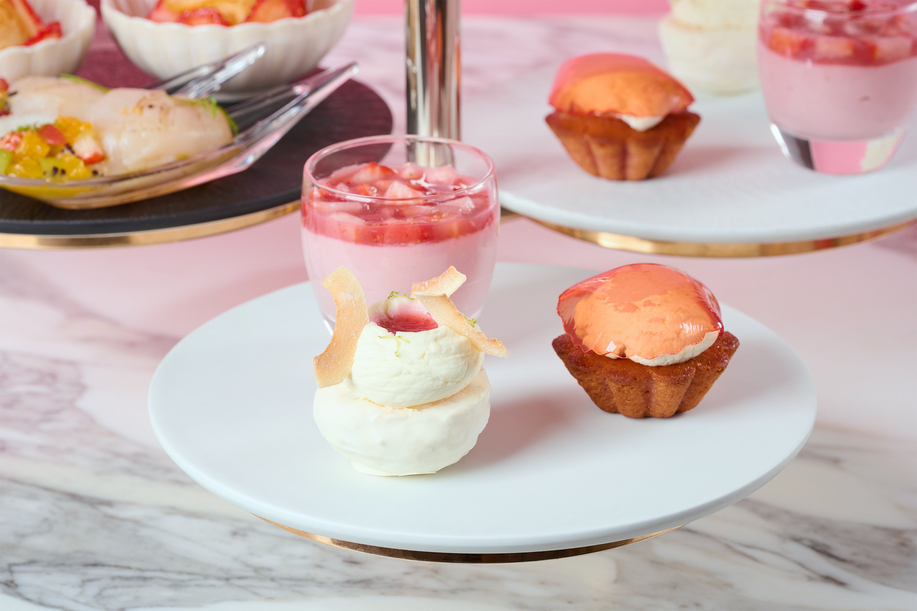 ขาตั้งหกชั้นมีขนมหวานเจ็ดประเภทและอาหารคาวสองรายการ โดยแต่ละรายการเน้นถึงลักษณะเฉพาะของสตรอว์เบอร์รีสายพันธุ์ต่างๆ ผู้เข้าพักสามารถเพลิดเพลินกับการเปรียบเทียบความหวาน ความเป็นกรด กลิ่น และเนื้อสัมผัสที่แตกต่างกันของสตรอว์เบอร์รีแต่ละสายพันธุ์ผ่านการคัดสรรที่คัดสรรมาเป็นพิเศษนี้