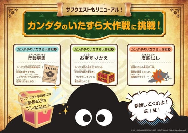 เควสต์ย่อยนี้จะเจาะลึกเรื่องราวเบื้องหลังที่น่าประหลาดใจของคันดะตะ หนึ่งในตัวละครที่เป็นที่จดจำมากที่สุดของซีรีส์ดราก้อนเควสต์ นักผจญภัยจะได้ออกสำรวจโลกของอาณาจักรโอนิโกการ์ด (Onokogard) เพื่อไขปริศนาเรื่องราวที่ถูกซ่อนอยู่