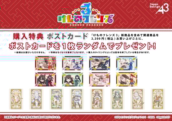 เมื่อมียอดซื้อสินค้าจาก Kemono Friends 3 และผลิตภัณฑ์ที่เกี่ยวข้องครบทุกๆ 2,200 เยน (รวมภาษี) จะได้รับโปสต์การ์ดสุ่ม 1 ใบ (จากทั้งหมด 16 แบบ) เป็นของแถม