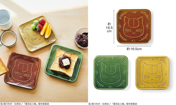 จานเซรามิกเซโตะทรงสี่เหลี่ยมที่มีลวดลายอาจารย์เหมียวยิ้มแฉ่งและดอกไม้นูนเด่น แต่ละชิ้นงานผ่านการเคลือบเงาด้วยมือจากช่างฝีมือ มีให้เลือก 3 สี คือ เหลือง, น้ำตาล และเขียว ขนาดประมาณ 16.5 ซม. × 16.5 ซม. เหมาะอย่างยิ่งสำหรับวางขนมปังปิ้ง หรือใช้เป็นจานใส่ของว่างก็ได้ เข้าไมโครเวฟและเครื่องล้างจานได้