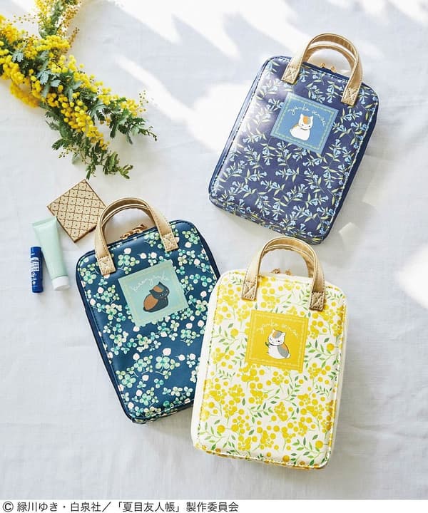 กระเป๋าแบนลวดลายพฤกษศาสตร์ที่มีอาจารย์เหมียวและแมวดำในดีไซน์สไตล์ฉลาก รูปทรงเพรียวบางพกพาสะดวก และดีไซน์ปากกว้างที่ทำให้มองเห็นของด้านในได้ทันที ด้านในมีซับในที่คงรูปกระเป๋าไม่ให้เสียทรงเมื่อใส่ในกระเป๋าใบใหญ่ พร้อมช่องตาข่ายขนาดเล็กและใหญ่ รวมถึงแถบยึดสิ่งของ ช่วยให้จัดระเบียบหน้ากากอนามัย ลิปสติก เจลล้างมือ ปากกา และอื่นๆ ได้อย่างเป็นสัดส่วน มีให้เลือก 3 ลาย ได้แก่ มิโมซ่า, โคลเวอร์ และเจนเทียน