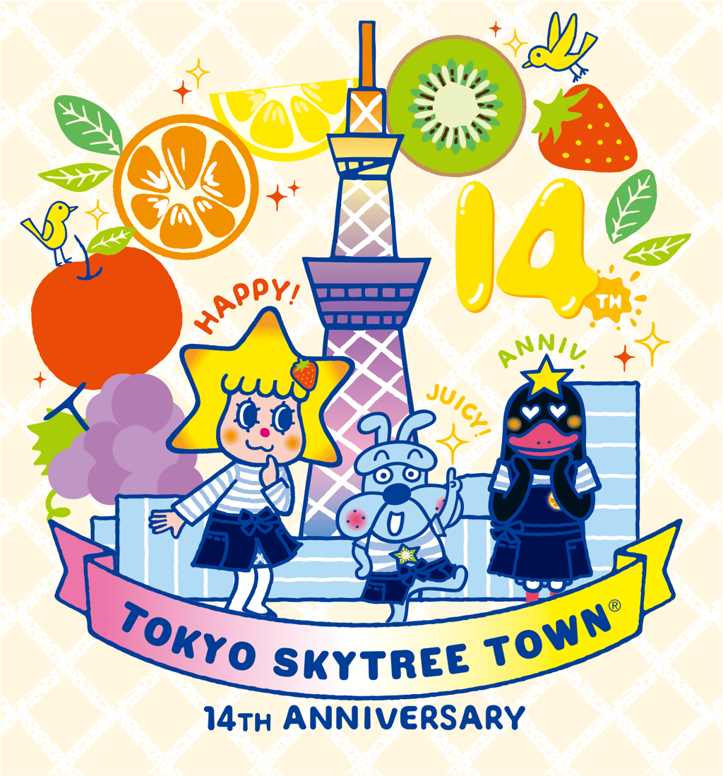 TOKYO SKYTREE TOWN ครบรอบ 14 ปีในวันศุกร์ที่ 22 พฤษภาคม 2026 เพื่อเฉลิมฉลองโอกาสนี้ จึงได้จัดกิจกรรมพิเศษในธีม "Juicy & Fresh" (ฉ่ำและสดชื่น) ซึ่งเป็นการเล่นคำกับตัวเลข 14 โดยจะจัดขึ้นตั้งแต่วันพฤหัสบดีที่ 23 เมษายน ถึงวันอาทิตย์ที่ 31 พฤษภาคม งานเฉลิมฉลองจะครอบคลุมทั้งตัวโตเกียวสกายทรีและศูนย์การค้าโตเกียวโซลามาจิ โดยมีกิจกรรมมากมาย ทั้งการต้อนรับจากตัวละครมาสคอต การแจกสติกเกอร์ต้นฉบับ การตกแต่งสถานที่ สินค้าลิมิเต็ดฉลองครบรอบ เมนูพิเศษ และเวิร์กชอปต่างๆ