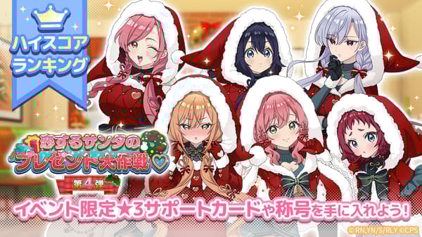 从12月25日(星期四)开始,将举办“爱意满满的圣诞老人的礼物作战♡ 第4部分”活动。在此活动期间,玩家可以使用在活动地图上收集的点数来抽取点数扭蛋,其中包括扭蛋券和活动专属★3支援卡。反复挑战活动以收集奖励!