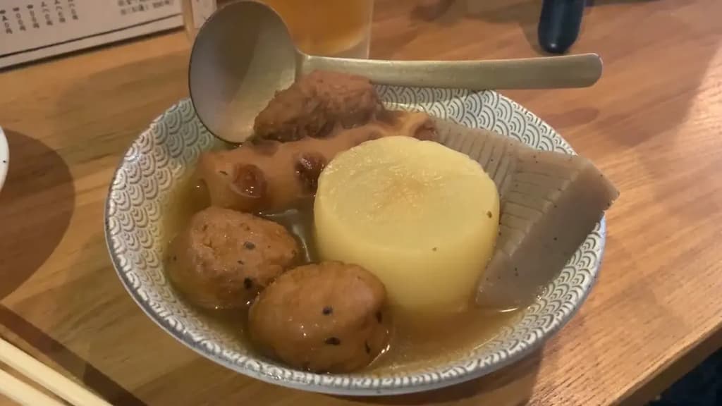 著名的咖喱关东煮有五种口味,售价500日元!咖喱汤汁令人上瘾且美味!