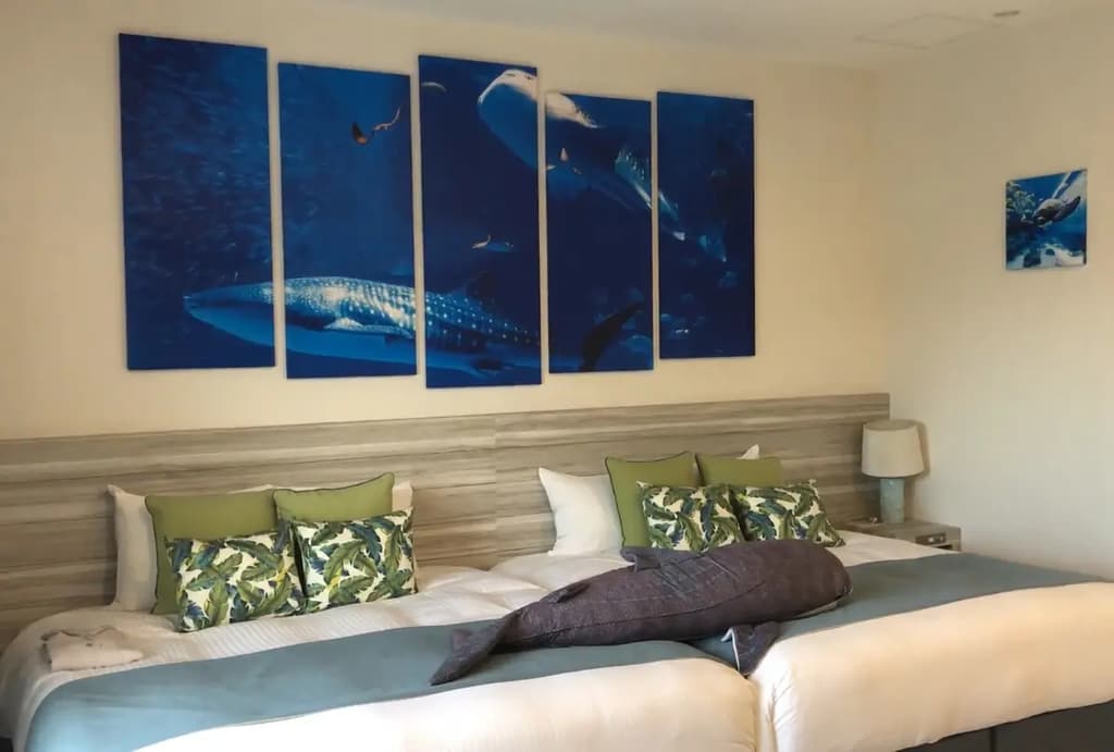 我们这次住的酒店房间在附楼,距离主楼步行很短。你可以看到隔壁的美丽海水族馆!房间有水族馆主题,散布在房间各处的鱼类图案很可爱✨