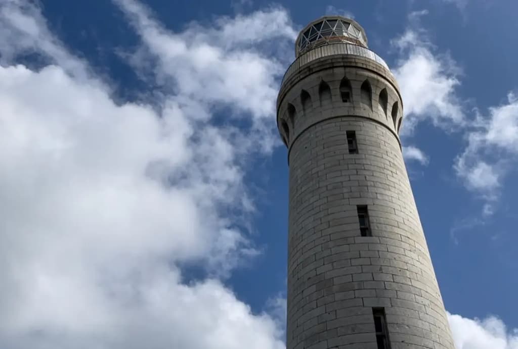 从日本海侧第一座灯台所在的公园,您可以从正下方仰望角岛灯台。