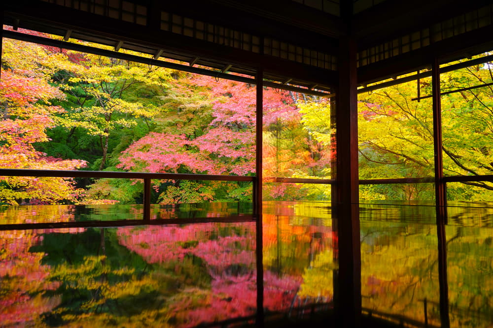 位于比叡山脚下,寺庙境内从10月初到12月初被鲜艳的树木覆盖,整个庭园被红色和黄色的秋叶包围。寺庙特别以从客厅二楼看到的秋叶景色而闻名,游客被透过窗户看到的庭园如画般的叶子所迷住。在秋叶季节,寺庙开放特别展览,让游客享受通常不可用的建筑内部和景色。